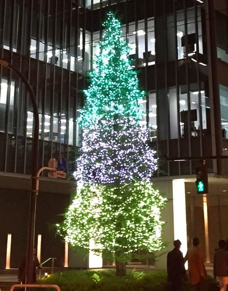 木の幹や枝の形に沿って光が灯り、日中とはまったく異なる幻想的な表情を見せてくれます。
