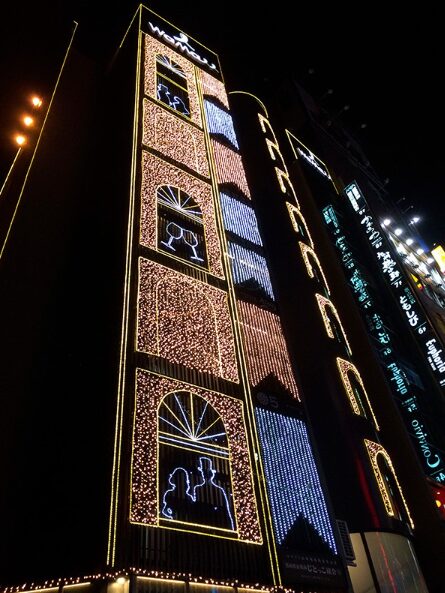 施設内の植木や街路樹にストリングスライトを巻き付けるのは、屋外イルミネーションの定番です。