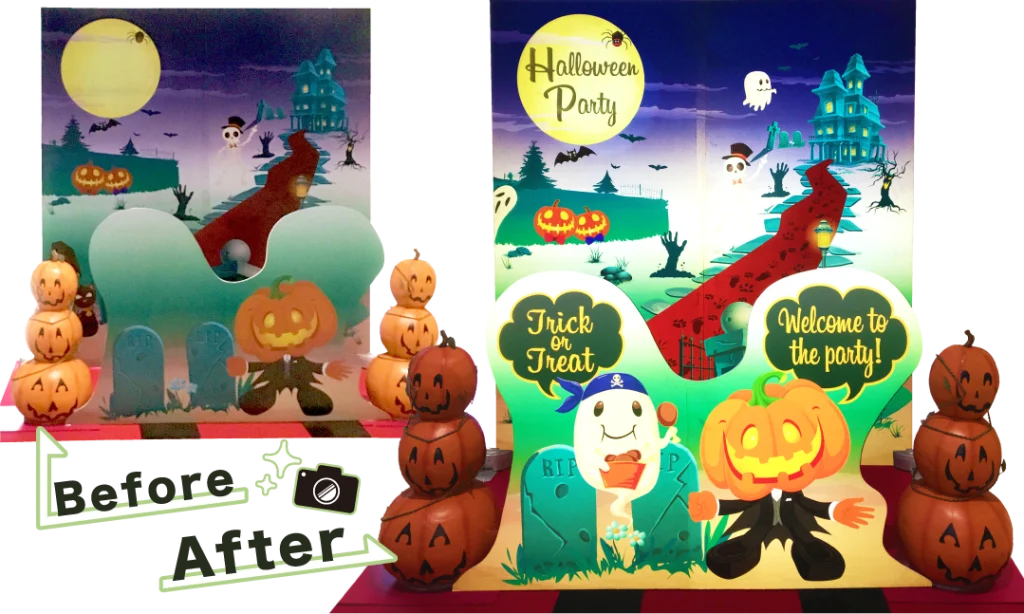 例えば、来場者が撮影すると、普通の背景から豪華な装飾や人気キャラクターが浮かび上がる仕掛けなどが来場者に好評です。