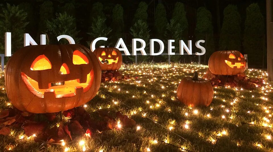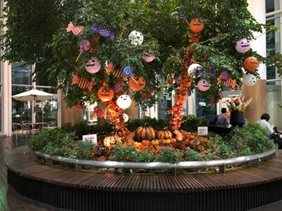 木にジャック・オー・ランタンを吊るしたり、植え込みにゴーストのオブジェを置いたりするだけで、ハロウィンの雰囲気を演出できます。