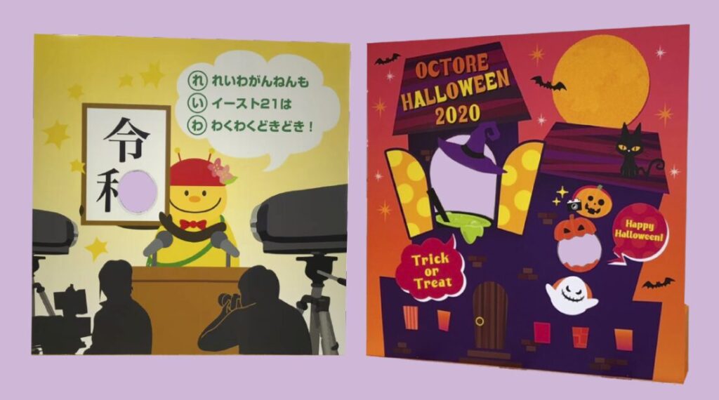 例えば、ハロウィンシーズンにはカボチャや魔女の帽子などの立体オブジェを配置することで、装飾に動きが生まれてボリューム感のあるフォトスポットが設置可能です。